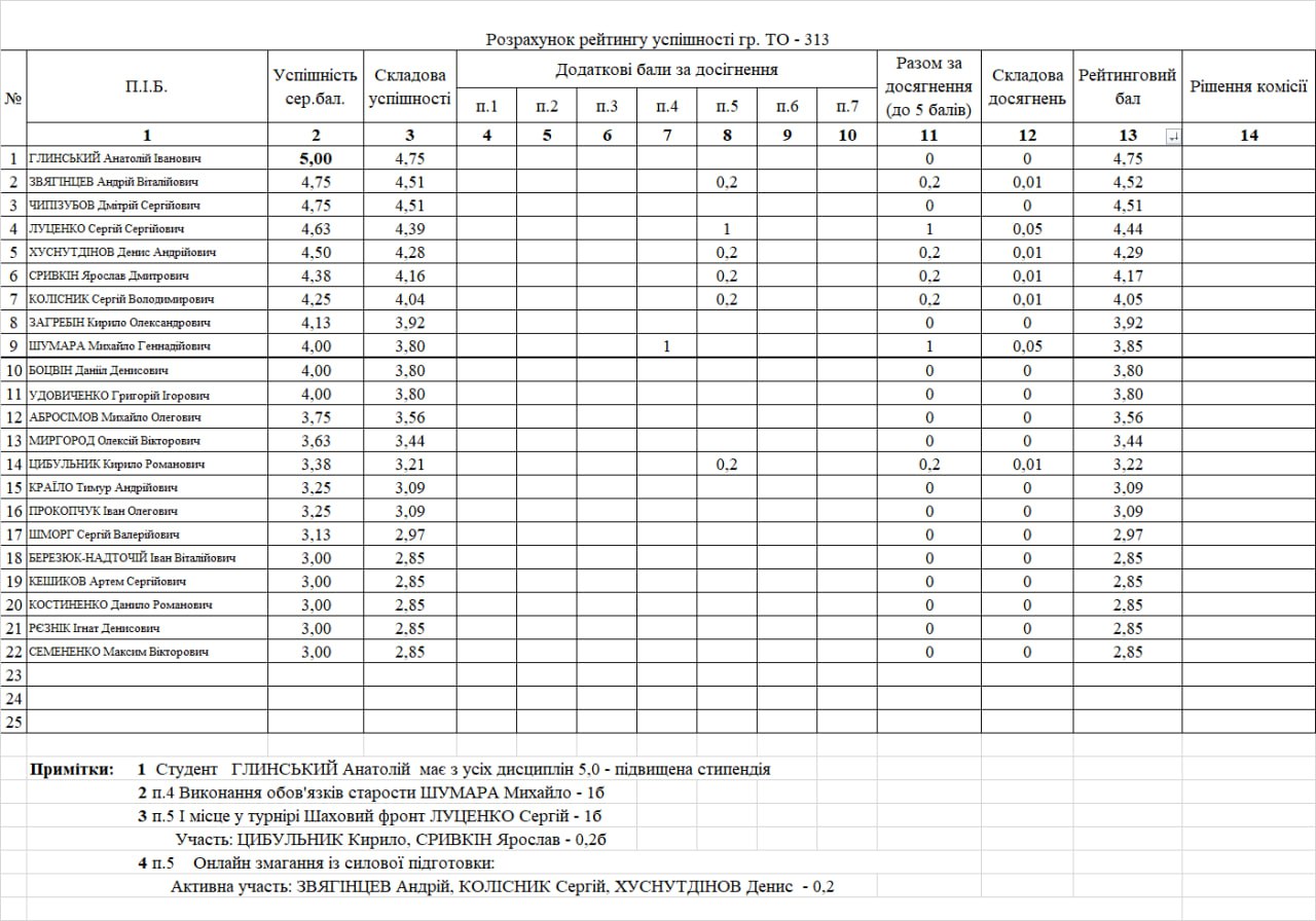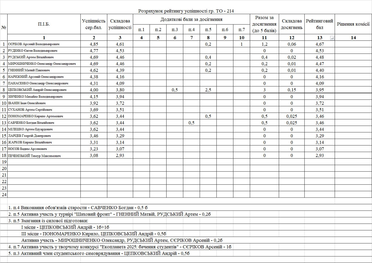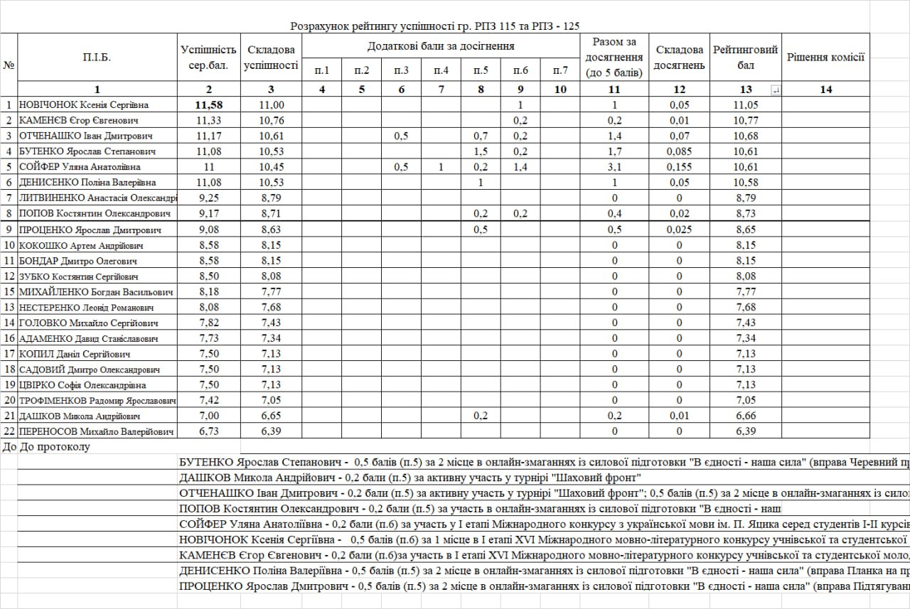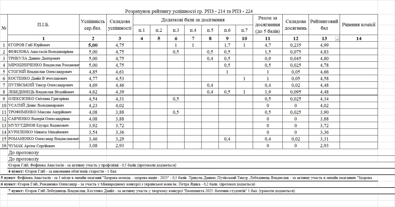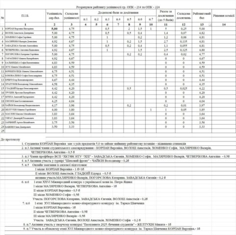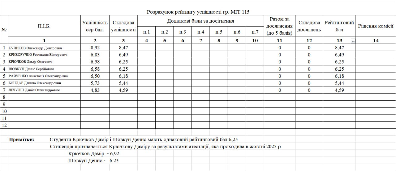 Рейтинг на отримання стипендії 1 півріччя 2025/26н.р.