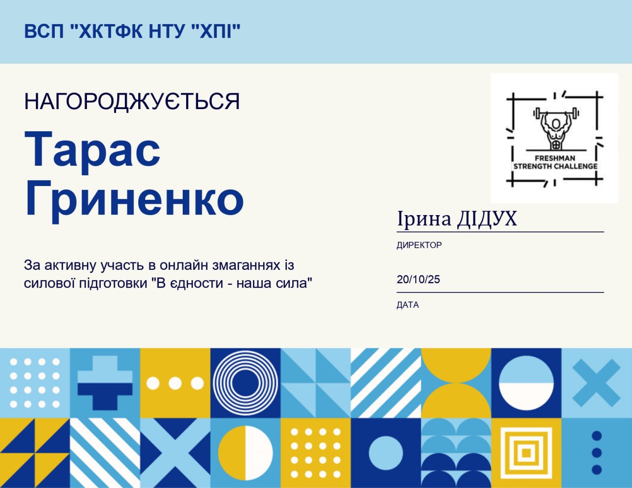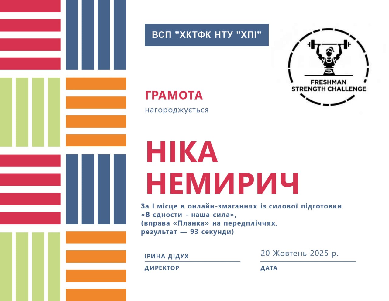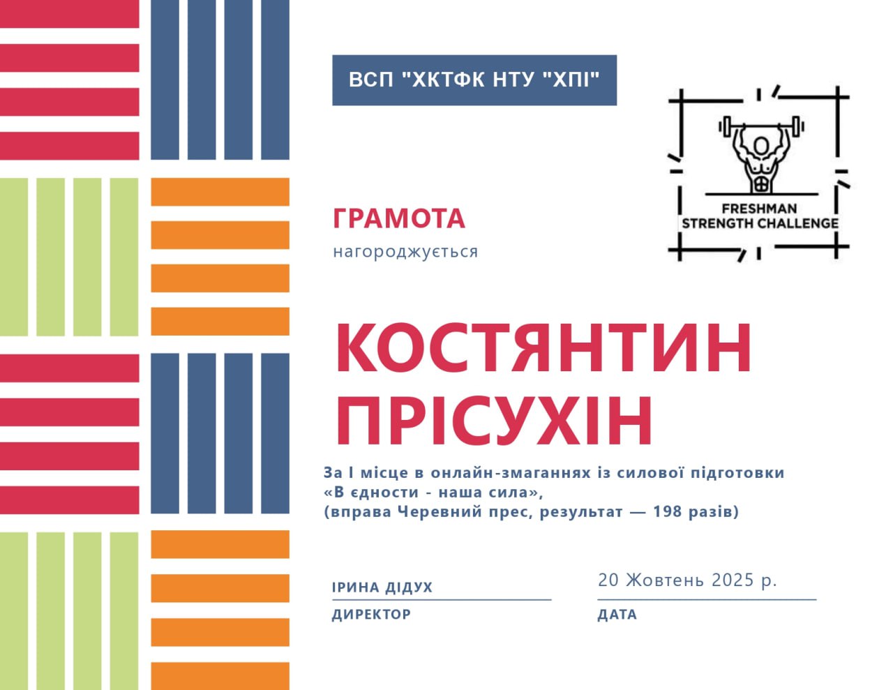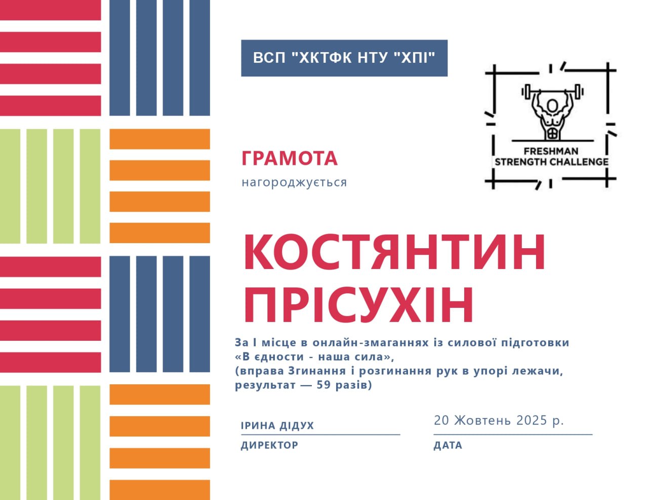 Жовтень у ВСП «ХКТФК НТУ «ХПІ» ознаменувався не лише навчальними здобутками, а й справжнім святом сили, витривалости та патріотизму. З 13 по 20 жовтня студенти першого курсу взяли участь в онлайн-змаганні «В єдности — наша сила», присвяченому Дню захисників і захисниць України — святу, що символізує мужність, гідність і незламність українського народу.