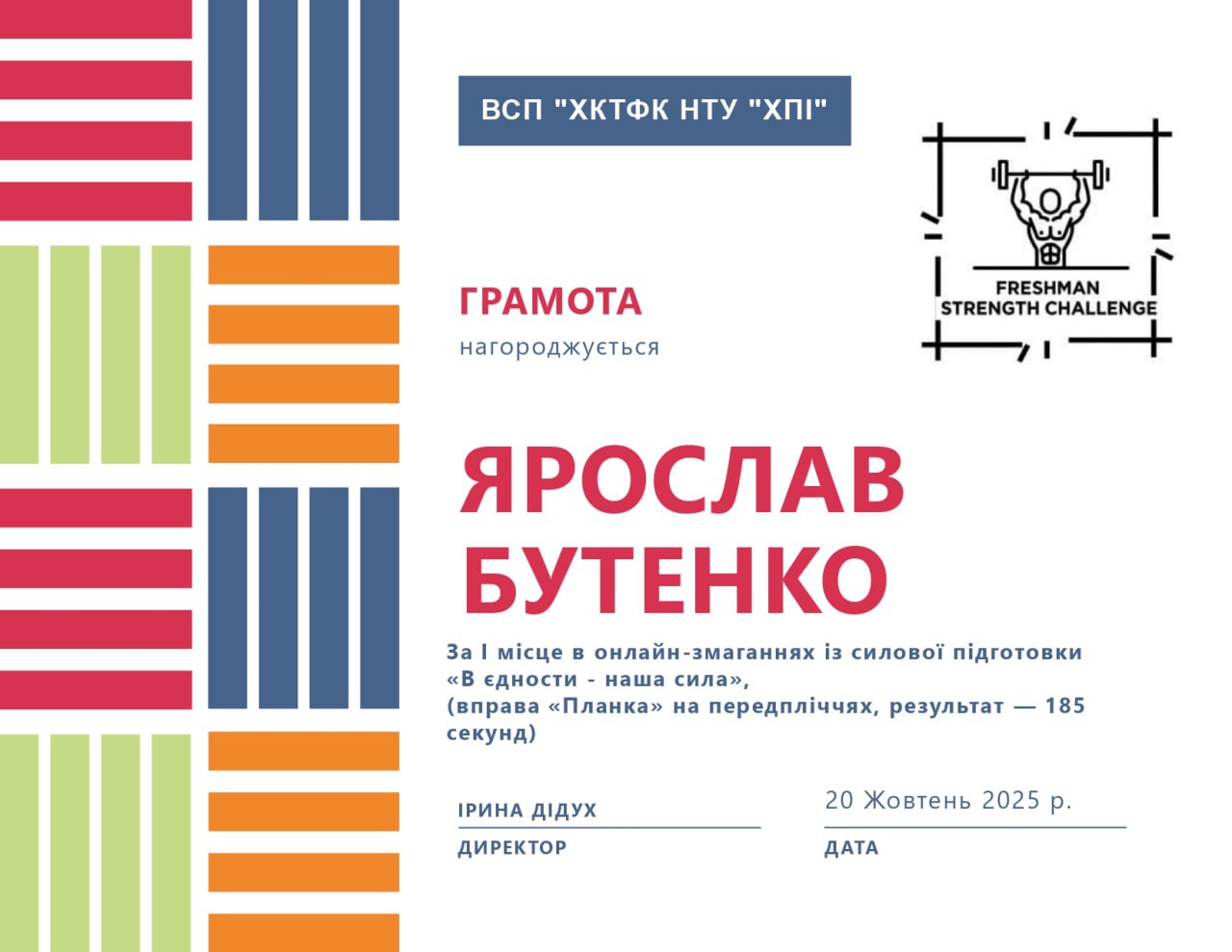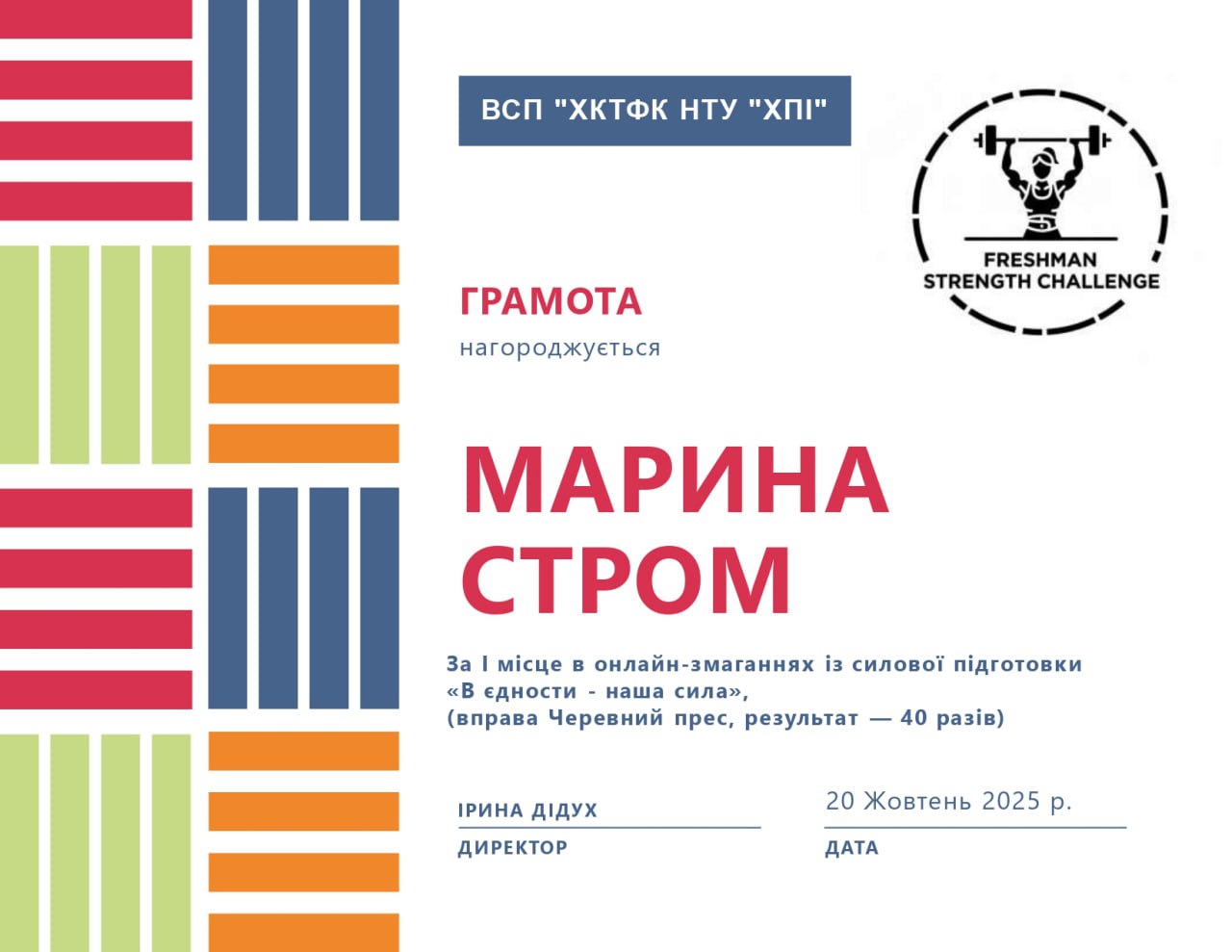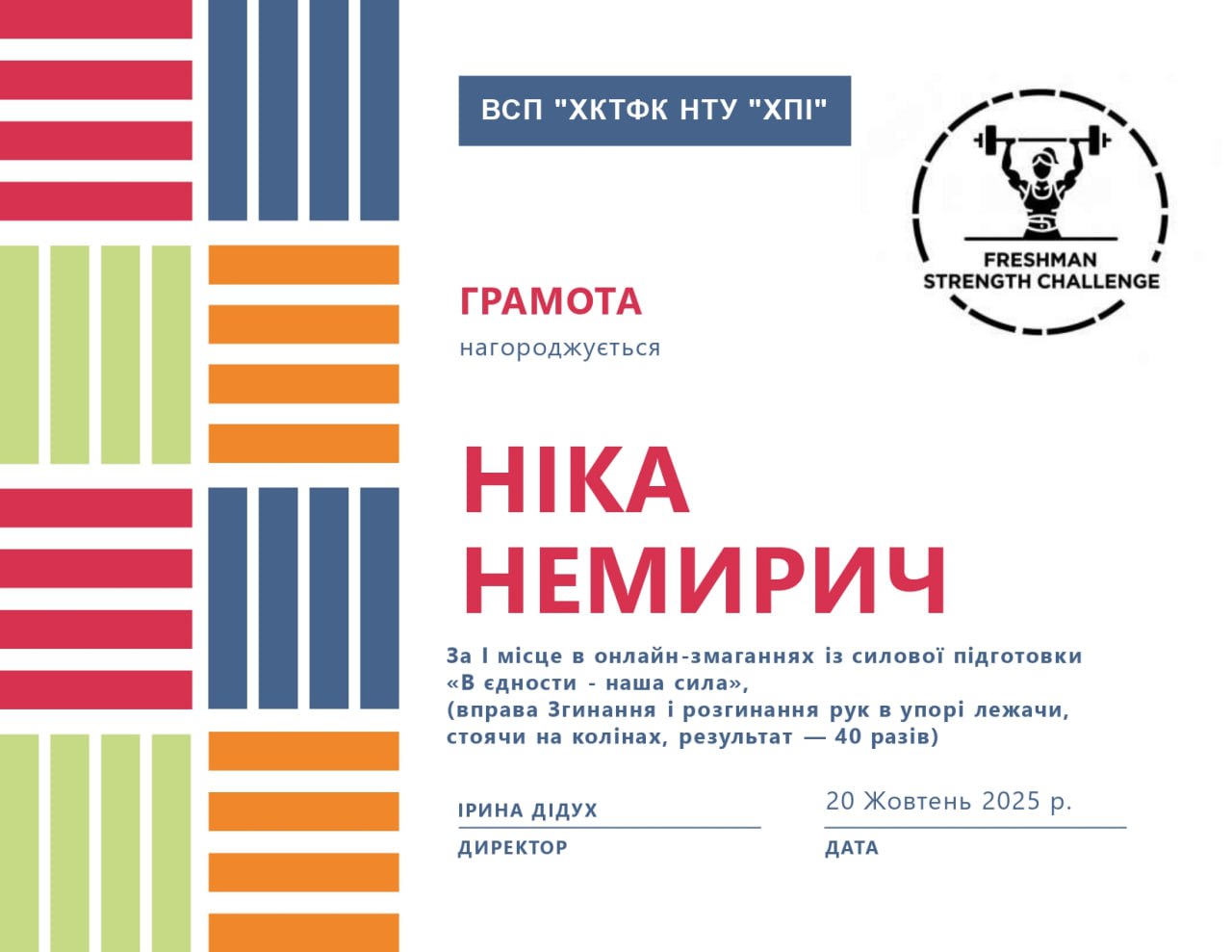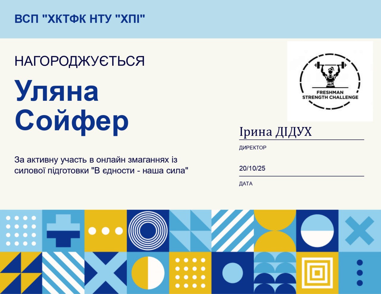 Жовтень у ВСП «ХКТФК НТУ «ХПІ» ознаменувався не лише навчальними здобутками, а й справжнім святом сили, витривалости та патріотизму. З 13 по 20 жовтня студенти першого курсу взяли участь в онлайн-змаганні «В єдности — наша сила», присвяченому Дню захисників і захисниць України — святу, що символізує мужність, гідність і незламність українського народу.