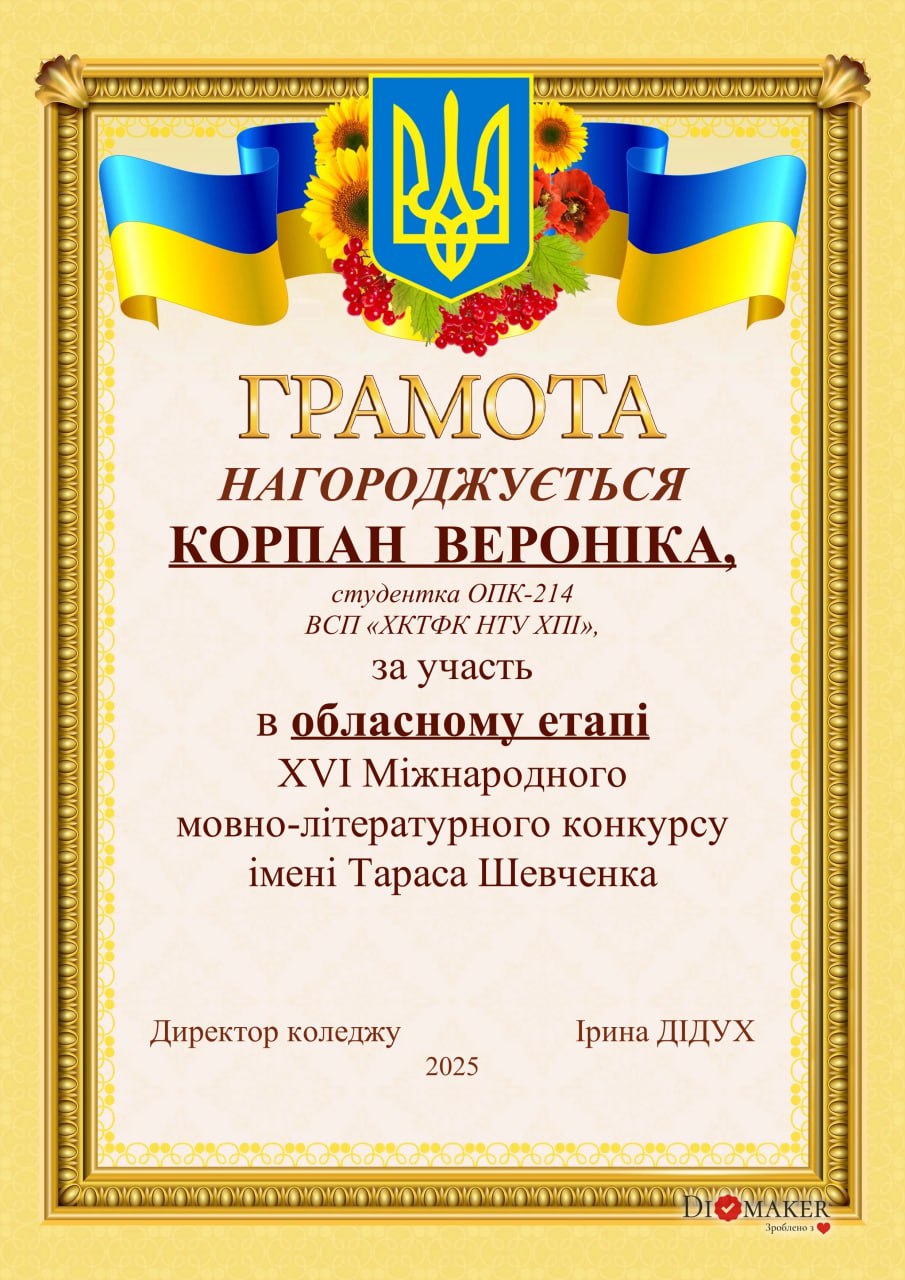 ​З особливим задоволенням та гордістю вітаємо КОРПАН ВЕРОНІКУ,  яка продемонструвала глибоке знання української літератури, високу мовну культуру та майстерність письма, завдяки чому показала високий результат!