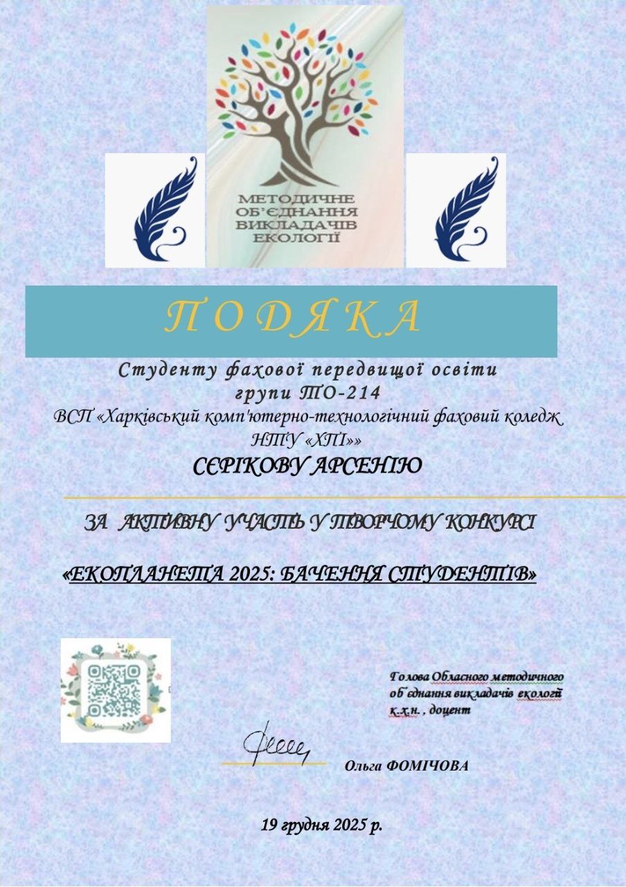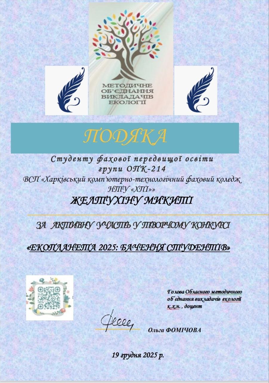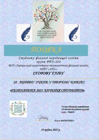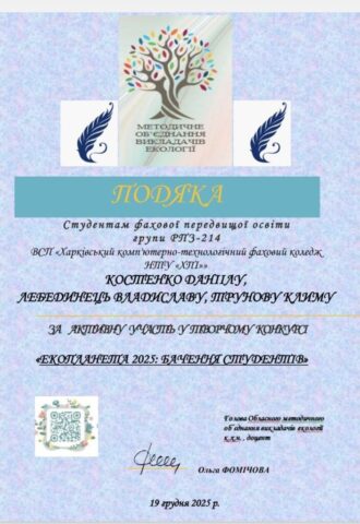 Новини Екопланета 2025: бачення студентів 24.12.202530.12.2025 Admin_Volodymyr Здобувачі освіти з нашого коледжу долучились до участі у творчому конкурсі “Екопланета 2025: бачення студентів”. Share